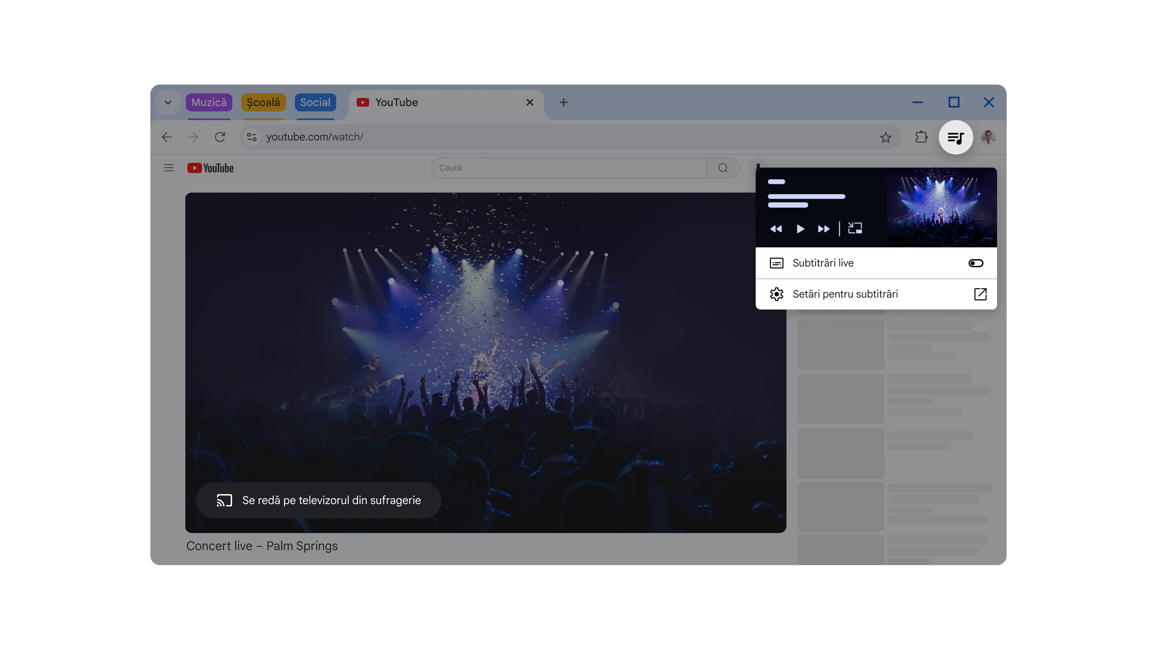 Un videoclip de la un concert este plasat în modul picture-in-picture.